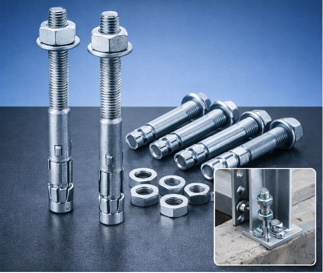 High-strength anchor bolt set including bolts, nuts and washers for structural anchoring,Used for anchoring industrial frames and metal structures to concrete foundations.